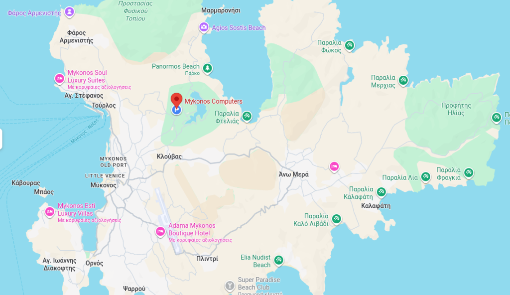 Το κατάστημα μας πολύ εύκολα μπορείτε να το βρείτε, κάνοντας αναζήτηση στο GOOGLE MAPS: MYKONOS COMPUTERS
